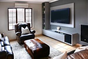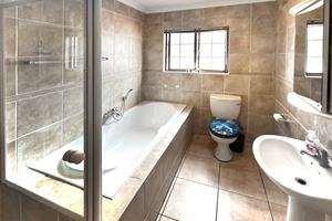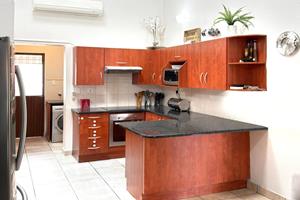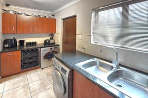 The open-plan kitchen and dining area with double volume ceilings are a chef's delight, featuring ample cupboard space and elegant granite countertops. The separate scullery adds convenience with room for two appliances and easy access to the courtyard, making meal prep and entertaining a breeze.