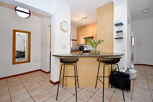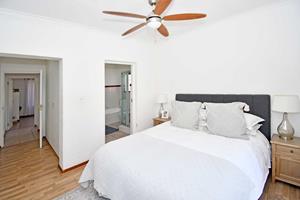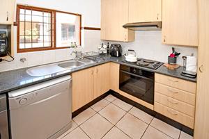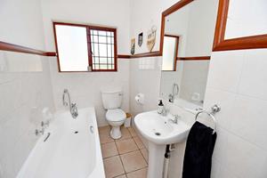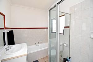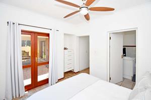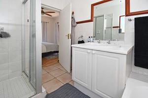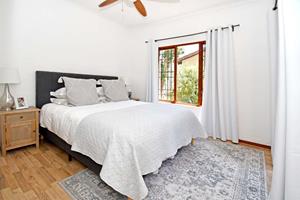 The main bedroom is generously sized, complete with built-in cupboards, ceiling fan, a stylish full en-suite bathroom, and direct access to the garden for a private retreat. The second bedroom is well-proportioned, with its own built-in cupboards, and is conveniently serviced by a perfectly placed guest bathroom.