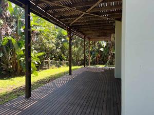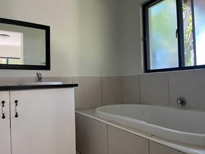 The home features a spacious, air-conditioned open-plan living area that flows seamlessly onto a private balcony/patio, perfect for relaxing while enjoying the serene indigenous forest outlook. A modern kitchen that is well-appointed with quality finishes and ample cupboard space.