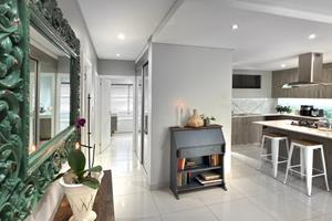 The spacious open-plan living area features striking bulkhead ceilings, contemporary lighting, and seamless flow onto a generous patio overlooking a beautifully developed private garden—perfect for relaxed outdoor entertaining. The modern kitchen boasts sleek finishes and ample workspace, enhancing both function and aesthetics.