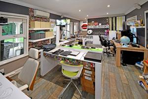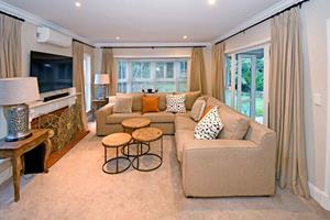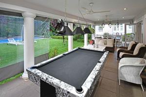 A versatile entertainment wing on the ground level (currently used as an office, with kitchenette, toilet and separate room) opens onto a covered patio with a built-in braai, overlooking the manicured garden and large heated swimming pool. This space can easily serve as a cottage, games room, man cave, studio or work-from-home suite.
